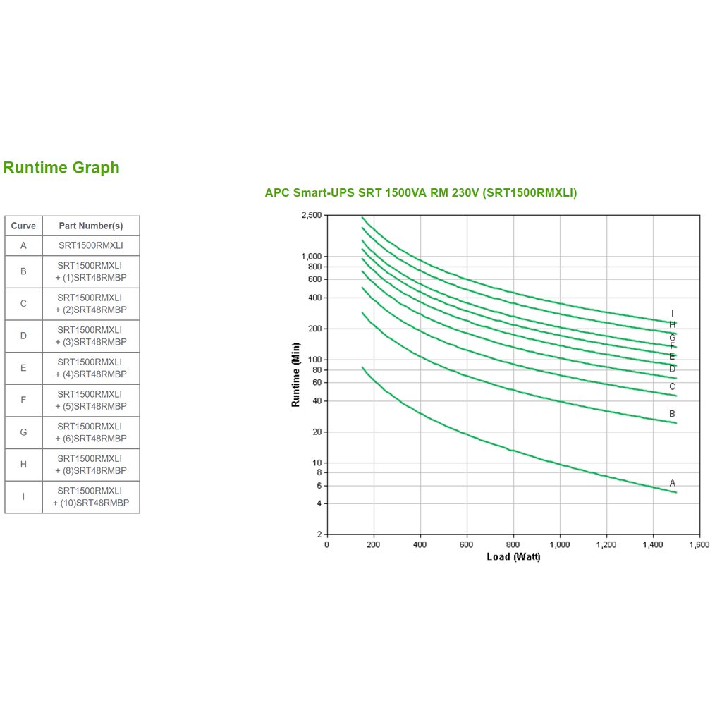 You can easily increase the number of minutes that the APC SRT1500RMXLI can independently supply emergency power by connecting external battery packs (SRT48RMBP). A runtime of several hours is even possible.