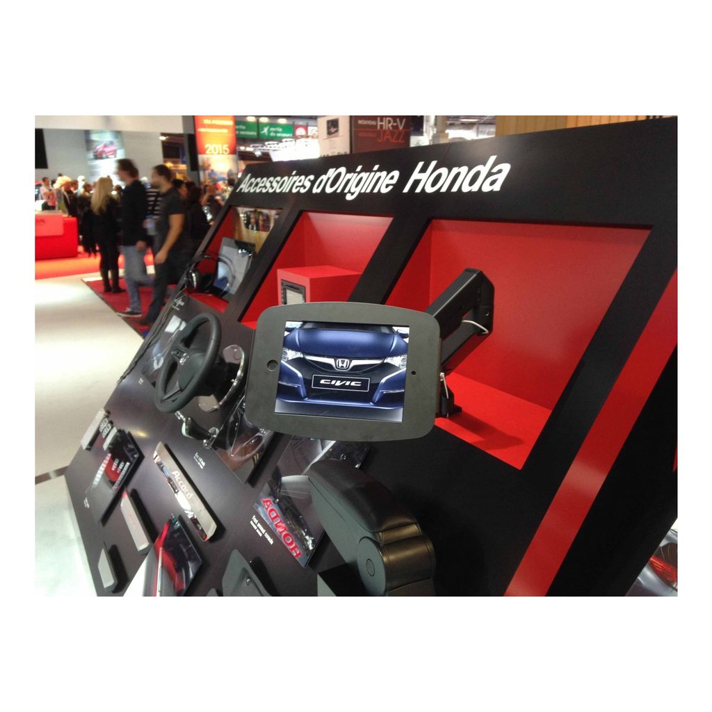The Space iPad Enclosure features rounded edges and open corners for improved ventilation and allows for limited access to buttons and inputs. Included is a removable home button cover to restrict access to the main button.