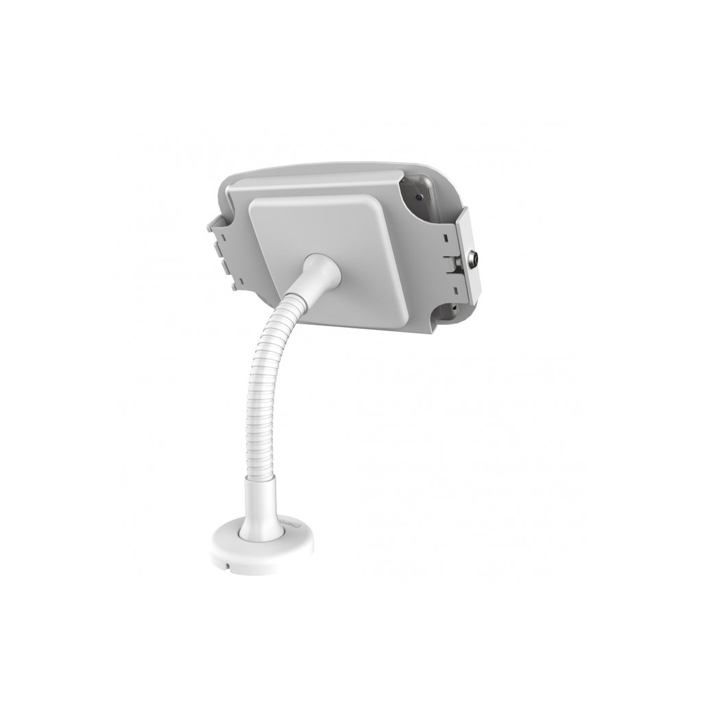 Our Flex Arm stand can be mounted on any flat surface, counter-top or to a wall for use as a secure interactive display or kiosk with a bendable arm that is great for corners and where counter space is limited. Limited cable management is available through the mount and arm of the stand (suitable for Lightning cable or up to Ø 10 mm cable extensions) and there is an adhesive no-screw base add-on available.