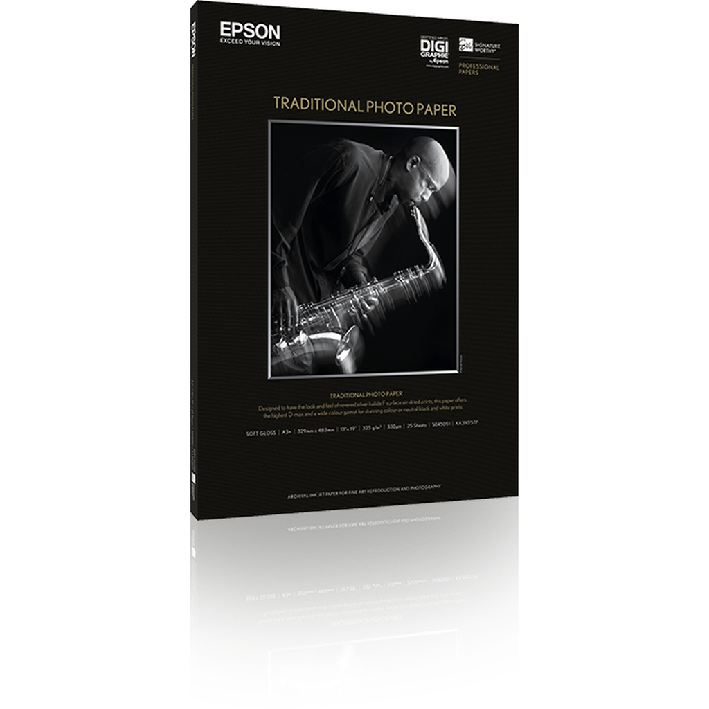 Epson Traditional Photo Paper is a breakthrough paper, designed exclusively for use with Epson’s UltraChrome K3 ink, developed in collaboration with many of the industry’s leading professional photographers to ensure it meets their most discerning requirements.Many who have contributed to the development of Traditional Photo Paper have commented that it reminds them of revered silver halide papers as well as providing greater creative control due to extraordinary D-Max and tonal transition in black and white. You can also print extraordinary colour with the same paper -something that was not possible with traditional fibre based papers.Combining the artistry of traditional photography with the ease and control of digital output, this unique media offers the same deep blacks, subtle tonal gradations and long-lasting results as the darkroom papers from previous generations. Its fibre base has a rich surface, a continuous tone and soft gloss that are ideal for creating stunning colour or neutral black and white prints that retain the look and feel of traditional fiber paper.Like all Epson innovative media, this paper is engineered to give you the highest resolution and colour saturation possible. As always, Epson supplies guarantees Epson quality.
