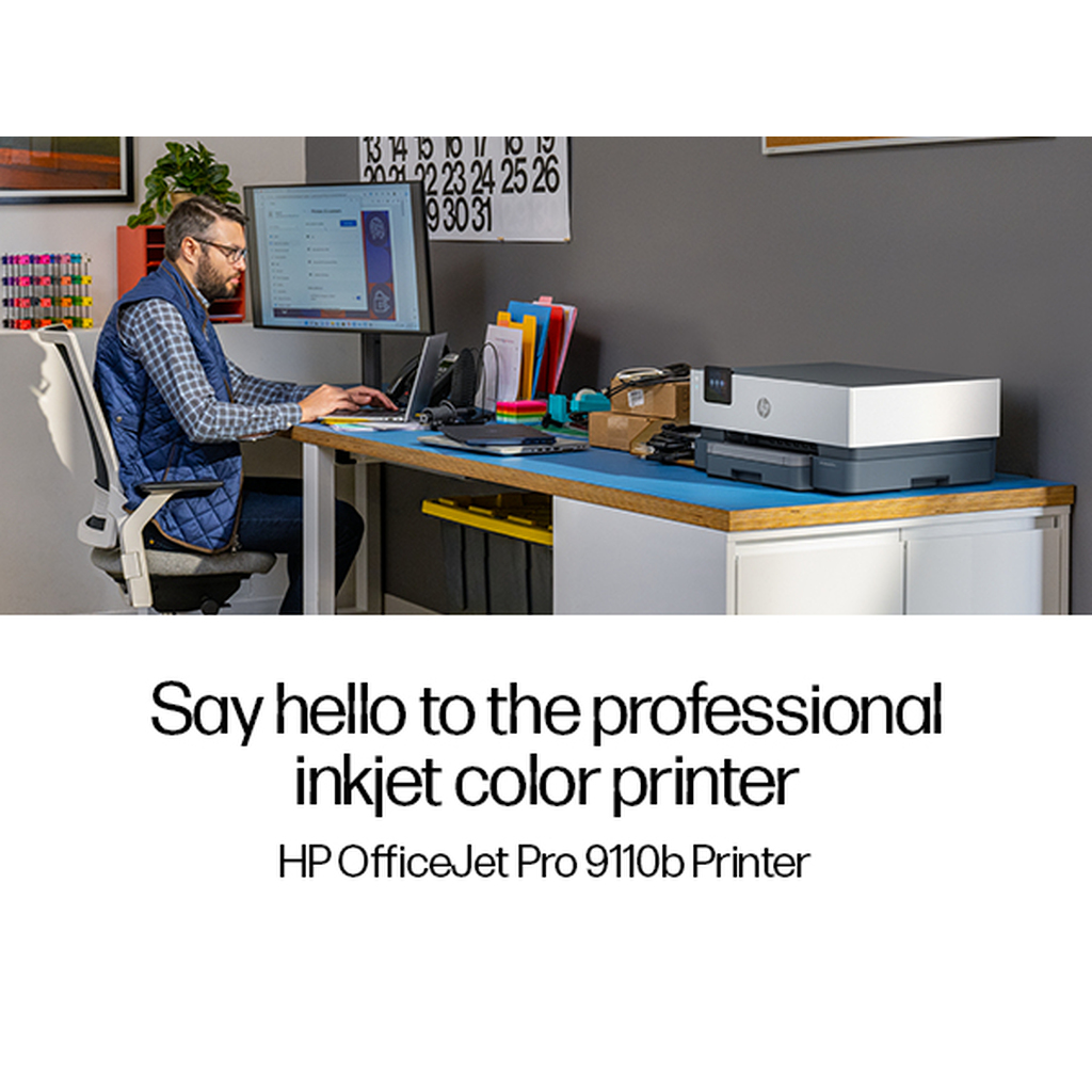 | Box contents | HP OfficeJet Pro 9110b Printer; HP 937 Setup Black Ink Cartridge (~800 pages); HP 937 Setup Cyan Ink Cartridge (~420 pages); HP 937 Setup Magenta Ink Cartridge (~420 pages); HP 937 Setup Yellow Ink Ca |