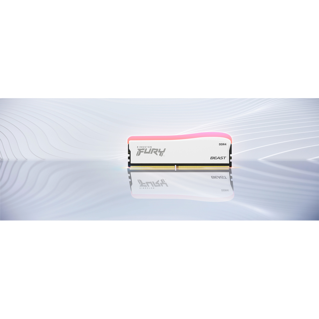 Kingston FURY™ Beast DDR4 RGB Special Edition** enhances both performance and style with speeds at 3200MT/s & 3600MT/s*, and unique white heat spreader and striking RGB lighting. Customize the RGB lighting effects with Kingston FURY CTRL™ software and keep the distinctive look coordinated with patented Infrared Sync Technology™. Available in CL16–18 latencies, single module capacities of 8GB & 16GB, and kit capacities of 16GB & 32GB. 100% tested at speed and backed by a limited lifetime warranty, this makes for a hassle-free upgrade for any Intel® or AMD-based system. Let Kingston FURY™ Beast DDR4 RGB Special Edition set you and your system apart of the rest.