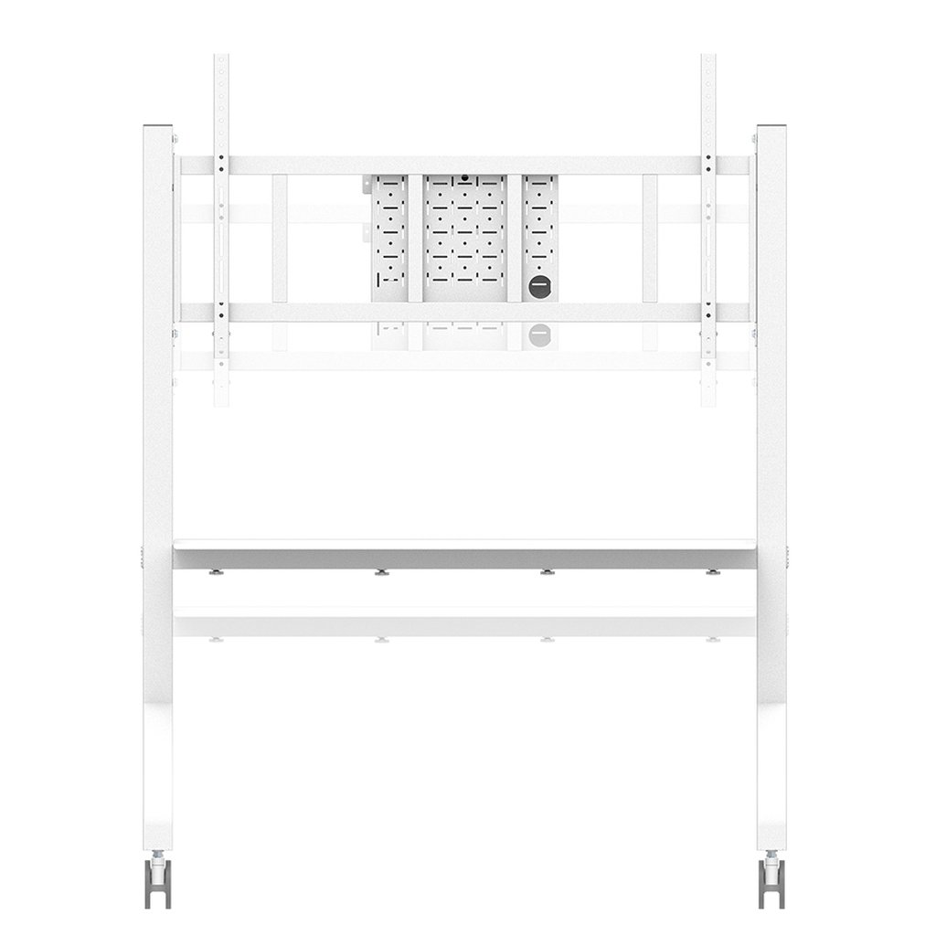 Designed with a sturdy structure, the MOVE Go XL offers the perfect solution for large and ultra-wide 105″ (touch) screens. The floor stand offers manual height adjustment in 2 preset positions, ranging from 129 to 139 cm, ensuring optimal viewing heights. For extra security, the screen can be fixed in place by locking the brackets using a padlock (not included). Additionally, a multimedia shelf (front and back mountable, max. 10 kg) and lockable, ventilated hardware compartment with cable opening are included and optional for installation.