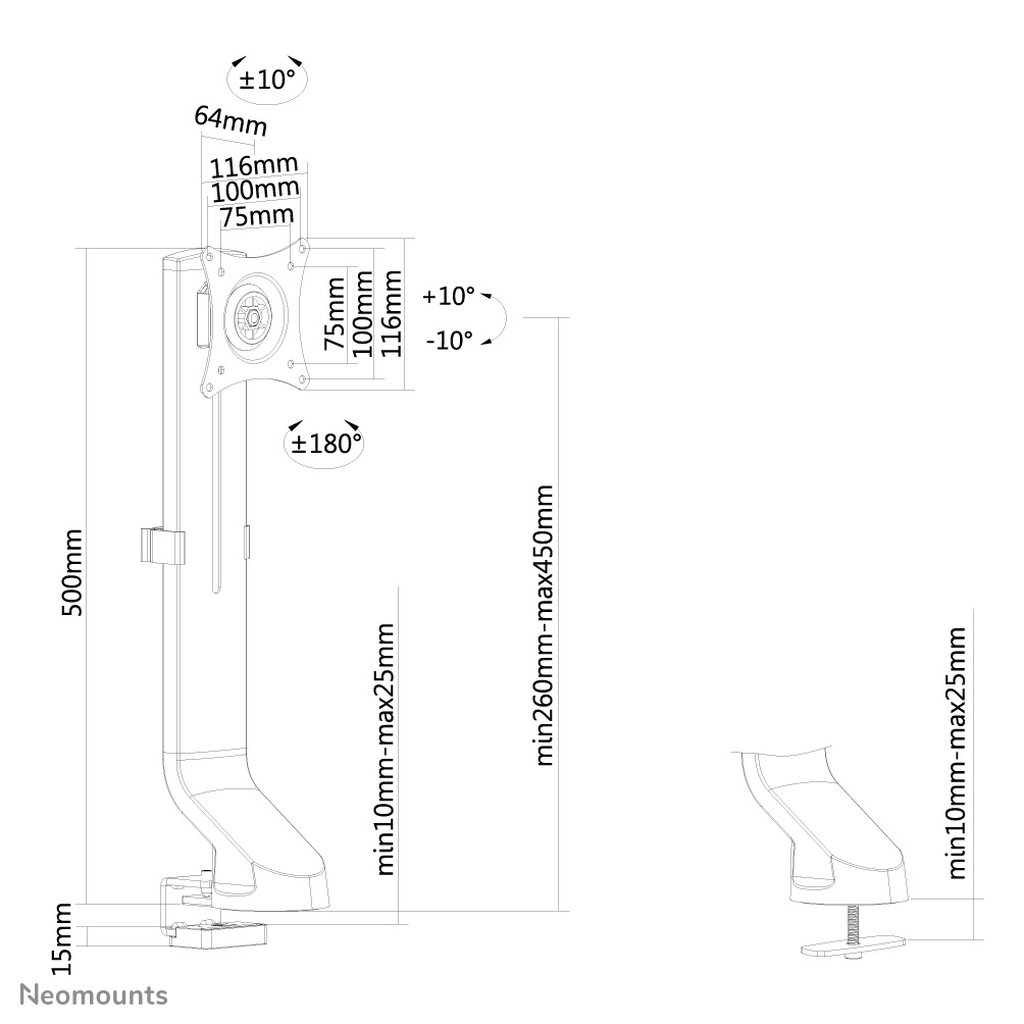 Neomounts FPMA-D860BLACK has one pivot point and is suitable for screens up to 32″ (81 cm). The weight capacity of this product is 8 kg each screen. The desk mount is suitable for screens that meet VESA hole pattern 75×75 or 100x100mm. Different hole patterns can be covered using Neomounts VESA adapter plates.