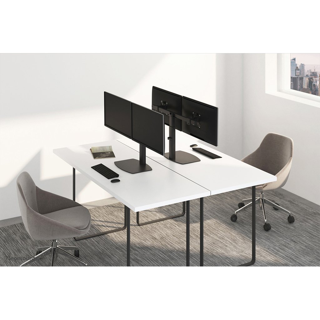 The Neomounts desk mount, model FPMA-D865DBLACK is a tilt-, swivel and rotatable desk mount for two flat screens up to 27″. This mount is a great choice for space saving placement on desks using a desk stand.