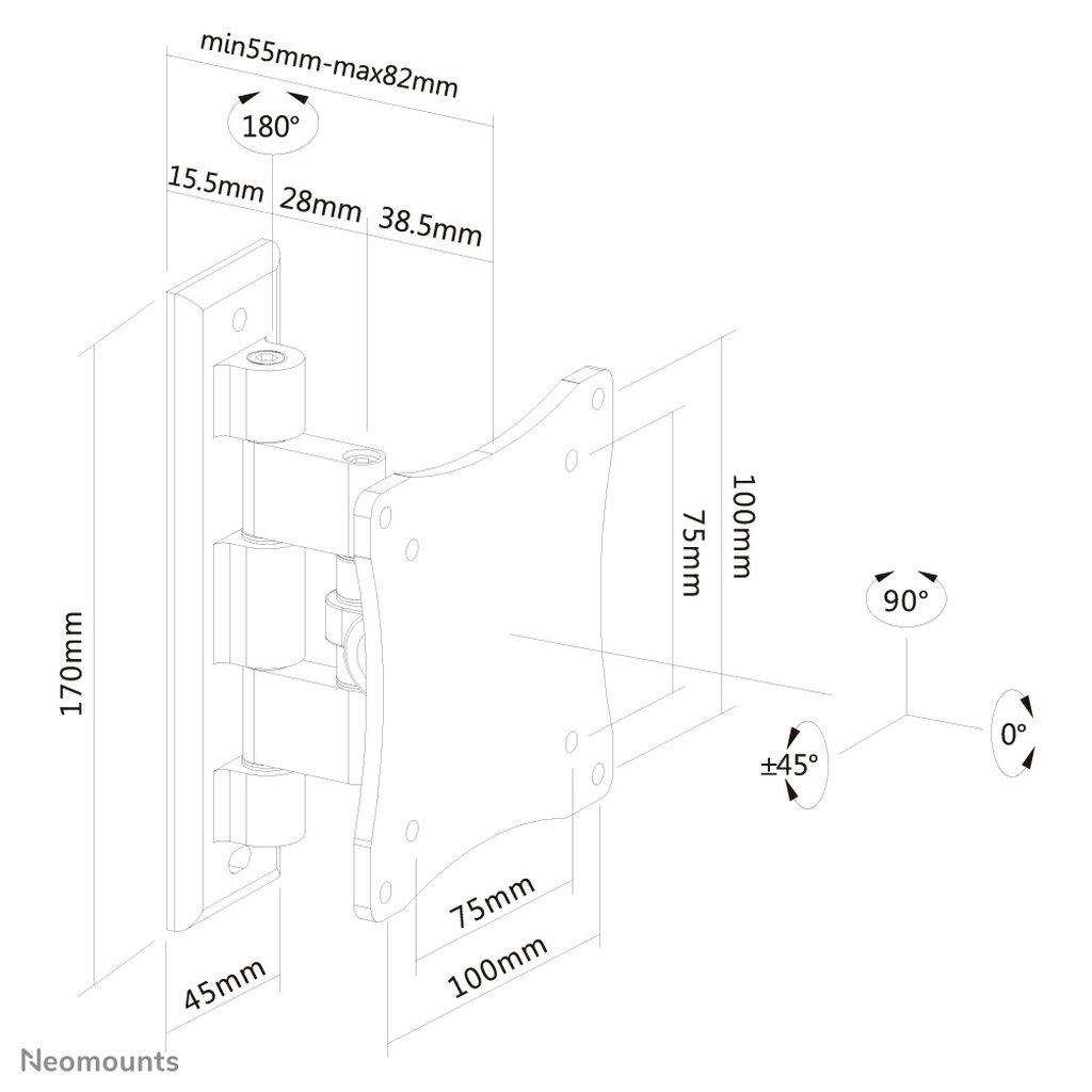 Neomounts’ tilt (20°) and swivel (180°) technology allows the mount to change to any viewing angle to fully benefit from the capabilities of the flat screen. The mount is easily depth adjustable from 4 to 7 centimetres.