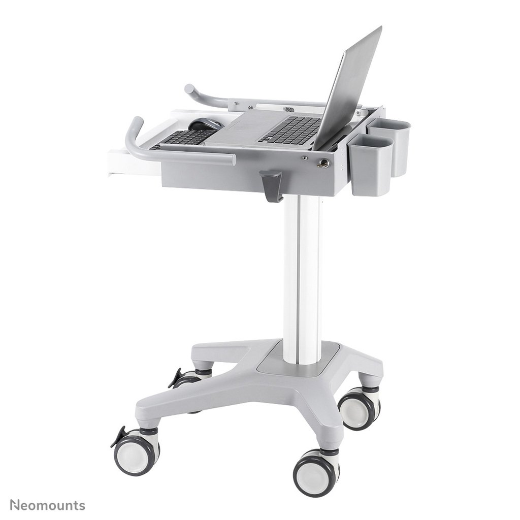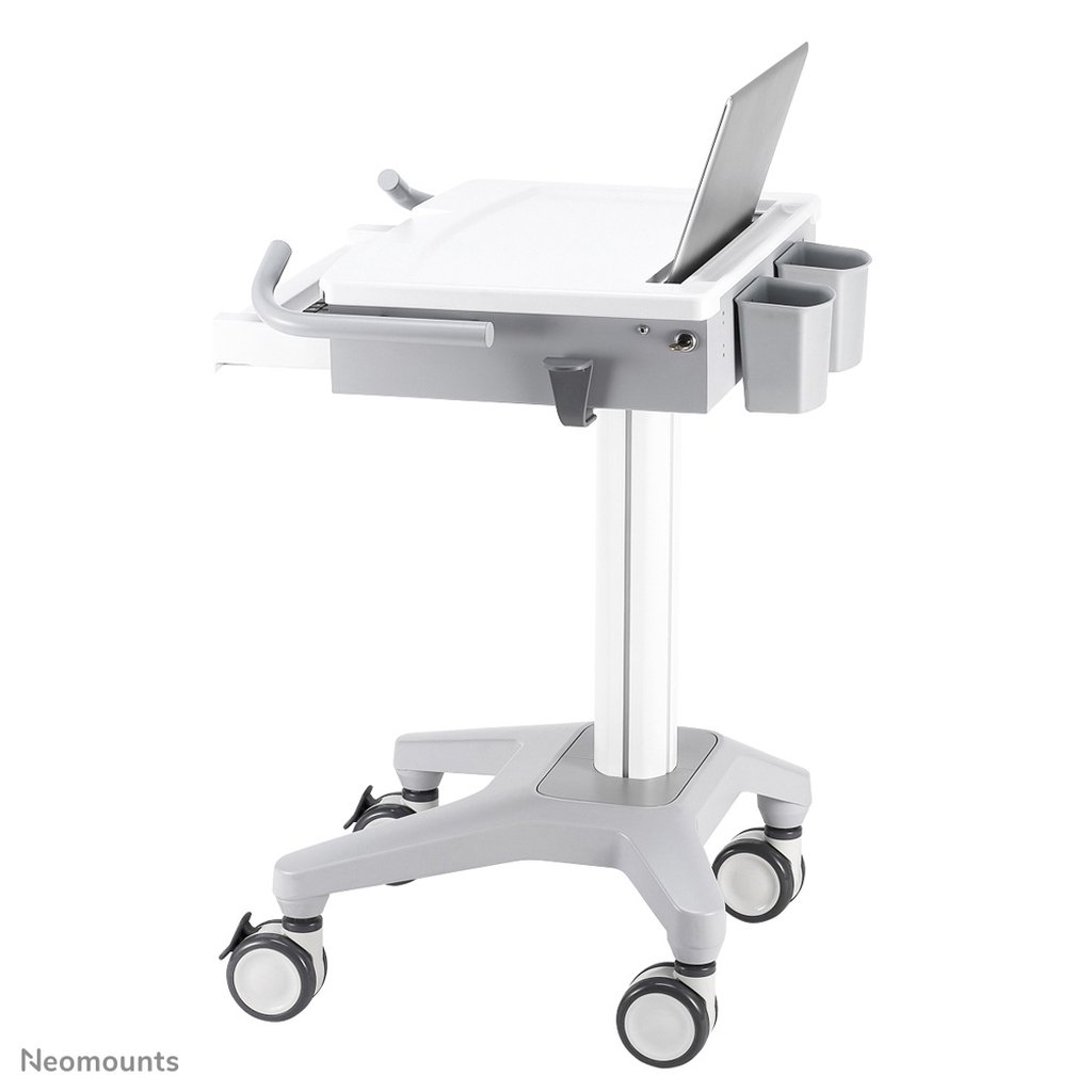 The Neomounts medical laptop cart, model MED-M200 is a mobile workplace for laptop, keyboard and mouse. This laptop cart is a great choice for space saving placement or when wall-, ceiling mounting or desk placement is not an option. This cart stretches your investment by sharing a workplace over multiple rooms like hospitals. Get optimal positioning for both standing and seated users, in any part of your location.