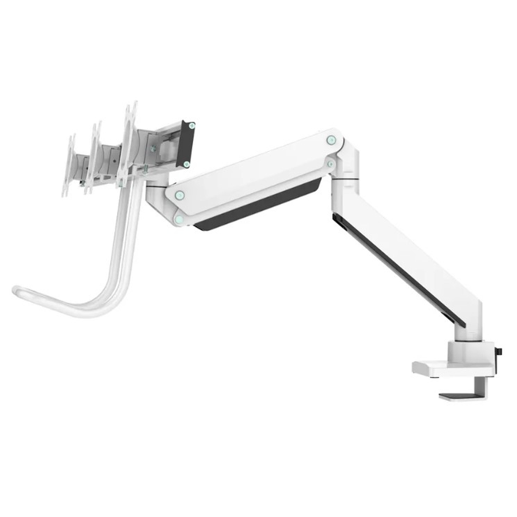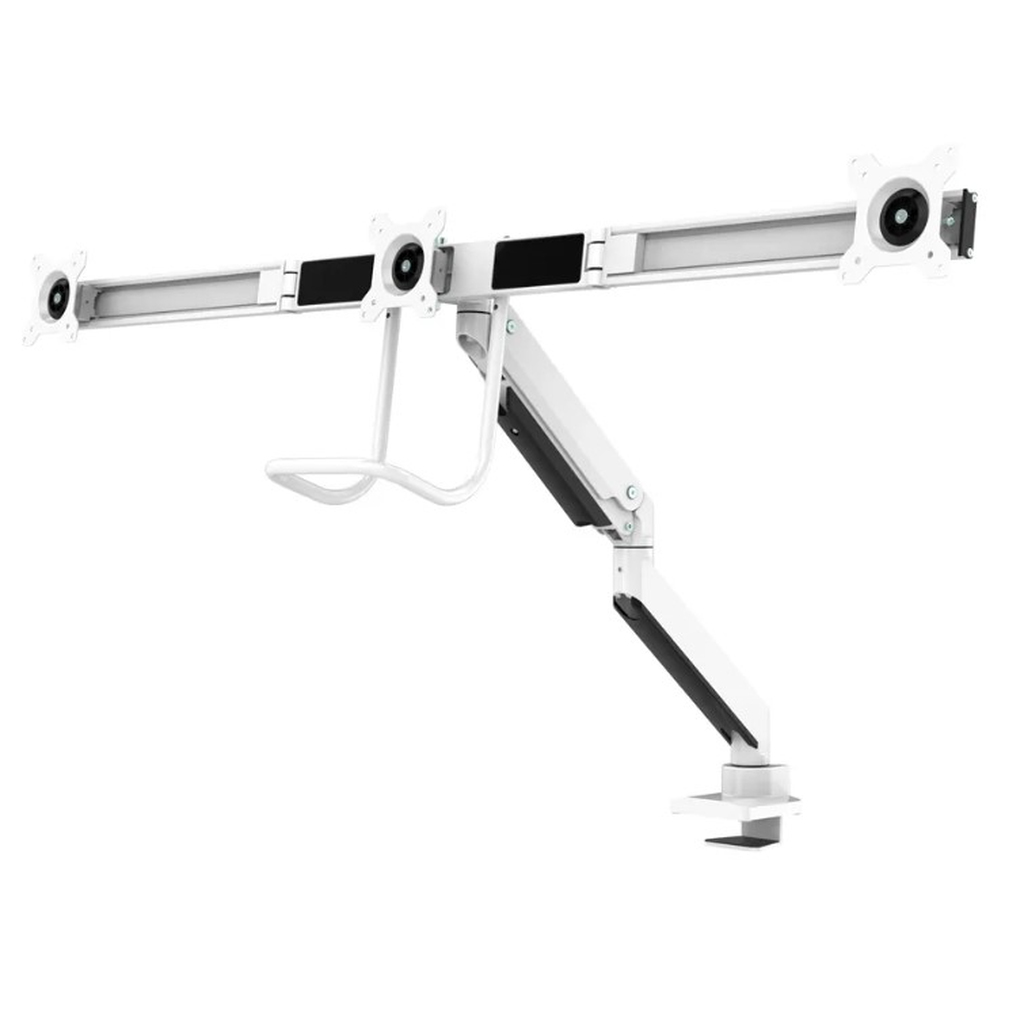 The Neomounts NM-D775DX3WHITE is a tilt-, swivel and rotatable desk mount with crossbar and handle for 2 flat screens up to 27″. This mount is a great choice for space saving placement on desks using a desk clamp or grommet mount.