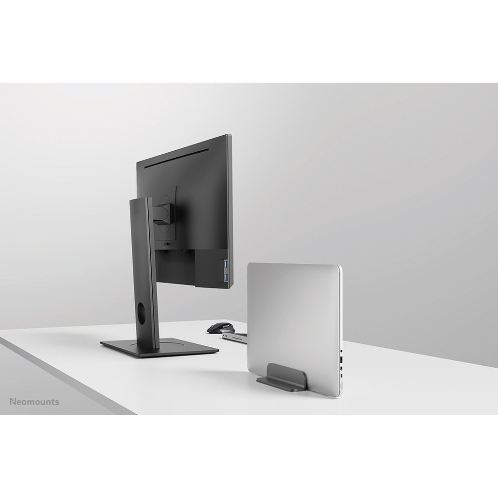 The Neomounts NSLS300 is a vertical stand for laptops from 11″ up to 17″. The holder is width adjustable, making it universally applicable. The solid aluminium design ensures secure positioning of the laptop. The NSLS300 is a smart space-saving solution for any desk.