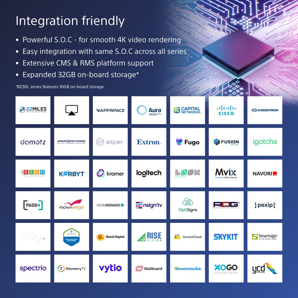 FW-65BZ40L is made for today’s connected world. There’s seamless support for today’s leading automation and control platforms, while open APIs simplify integration with other vendor solutions.