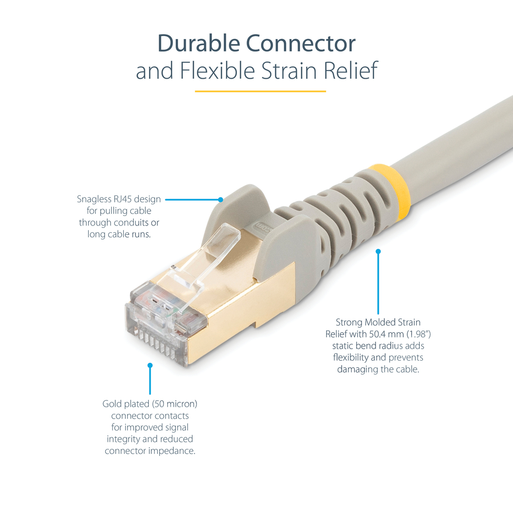 The cable also features molded boots which offer connector strain relief by stopping the RJ45 connector termination points from bending at sharp angles. This reduces the risk of damage to the cable, which could decrease network connectivity and performance.