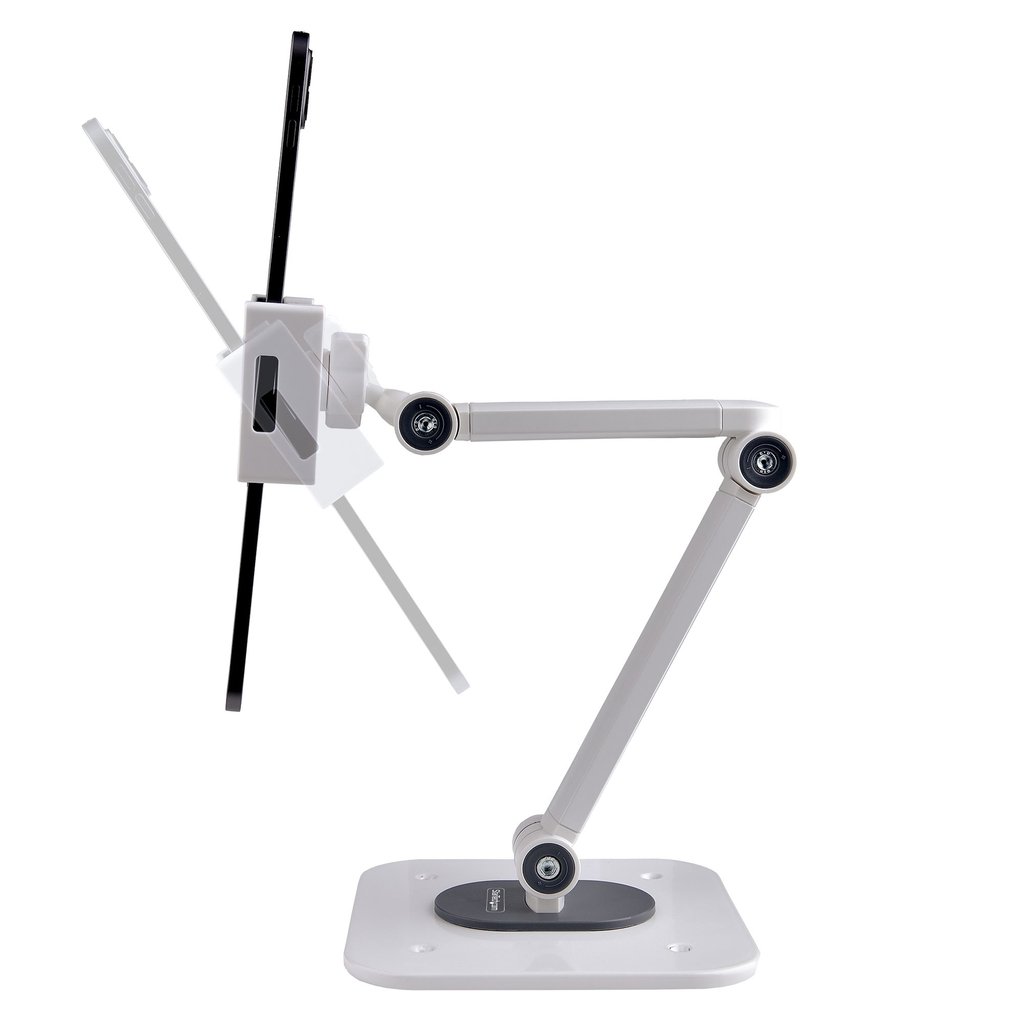 The jointed arm allows to adjust the height up to 18.5in (47cm) from the base and allows for various angle adjustments. The adjustable ball joint located at the end of the arm enables +/-52° swivel and 360° rotation for horizontal/vertical viewing. The elbow behind the ball joint provides +210° / -60° of tilt. The design of the Clamp does not block the ports, front-facing camera, or buttons, allowing users to take advantage of the features of a tablet.