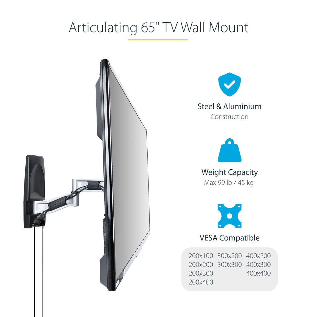 StarTech.com Articulating TV Wall Mount, VESA Wall Mount, Supports 65 inch/99lb/Flat/Curved TVs, Retractable Low Profile Wall Mount TV Bracket, Adjustable Corner TV Wall Mount (TV-WALL-MOUNT-65FS)