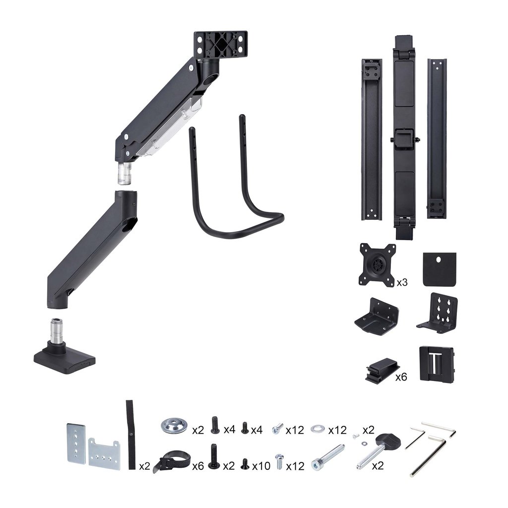 This crossbar monitor desk mount is designed to support up to three 27-inch displays, creating an ergonomic multi-monitor setup that provides an extensive viewing area for productivity. A built-in handle enables moving all monitors simultaneously, while the spring-assisted arm allows multiple adjustments to suit different ergonomic needs.