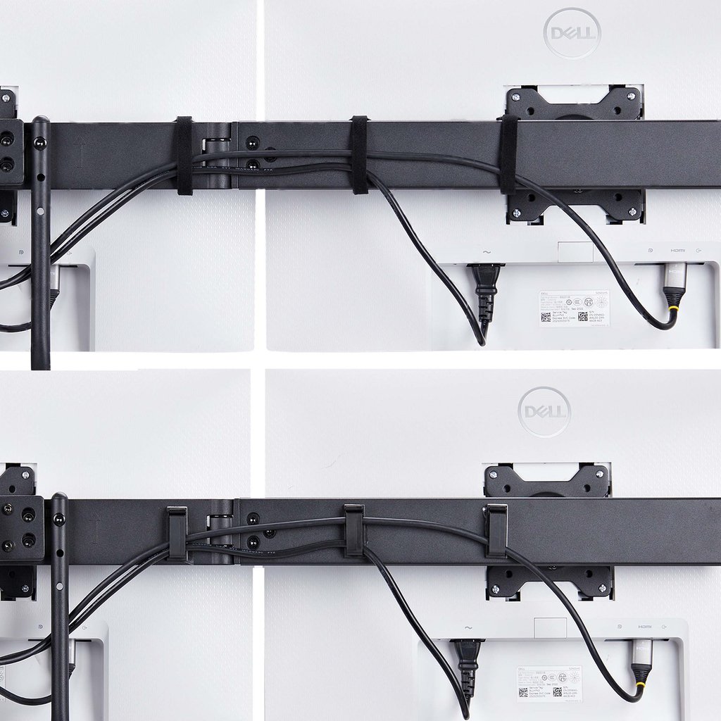 The monitor crossbar allows toolless adjustments of +/-15° horizontal swivel of the outer displays. The monitors’ VESA mounts enable +/-10° horizontal swivel, +5/-15° tilt, and 360° screen rotation for portrait or landscape orientations.