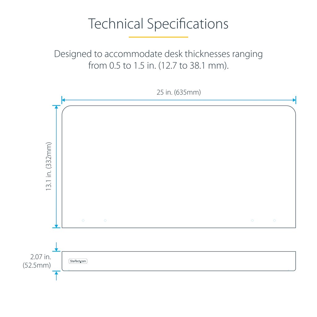 Add 25×13.1in (635×332 mm) to the corner of an L-shaped desk creating enough area for a keyboard and a mouse. The Desk Corner Sleeve is compatible with desks 0.5 to 1.5in (127 to 381mm) thick. The desk extender enhances the ergonomics of corner desks by supporting the wrists while typing.