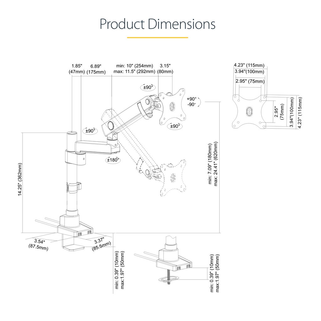 With its articulating arm, the monitor mount makes it easy to find the right viewing angle. Pan +90/-90 degrees left or right and tilt your display +90/-90 degrees up or down. For landscape or portrait viewing, rotate your display +90/-90 degrees.