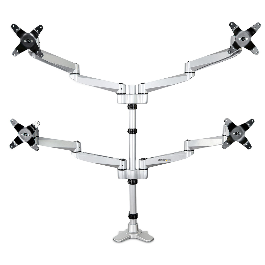 StarTech.com Desk Mount Quad Monitor Arm – Premium Articulating VESA 4 Monitor Mount 2×2 up to 30″ – Ergonomic Height Adjustable Pole Mount – Tilt/Swivel/Rotate – C-Clamp/Grommet – Silver (ARMQUADPS)