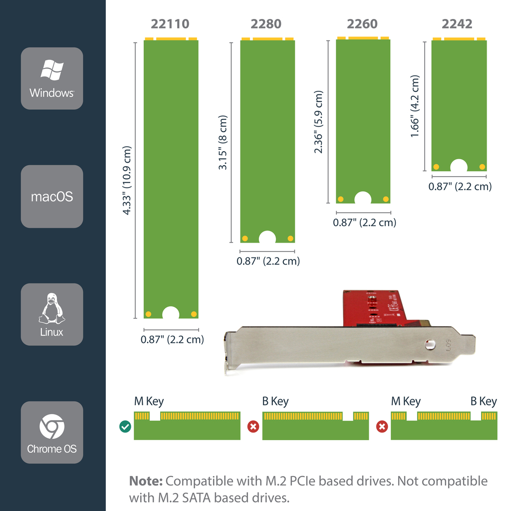 The adapter supports PCIe 3.0 x4 NVMe (M Key) and PCIe-AHCI M.2 SSDs including 2242, 2260, 2280, and 22110 drives. The expansion slot adapter supports the most common drive sizes including 110 mm, 80 mm, 60 mm and 42 mm.