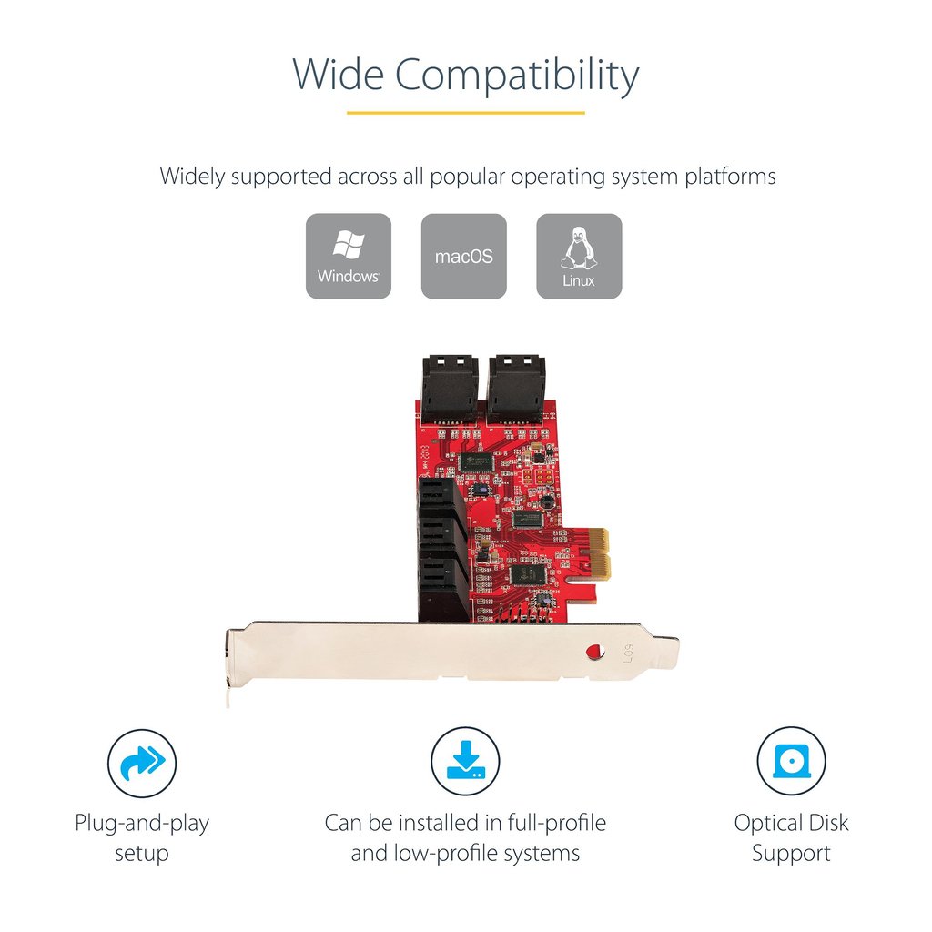The SATA controller card features plug-and-play installation and can be installed in a full-profile or low-profile computer systems with the full-profile bracket preinstalled, and an interchangeable low-profile (half-height) bracket included. The card also supports storage software data management systems such as Storage Spaces (Microsoft), RAID Assistant (MacOS) and mdraid/mdadm (Linux), for hassle-free setup, partitioning and software RAID array building.