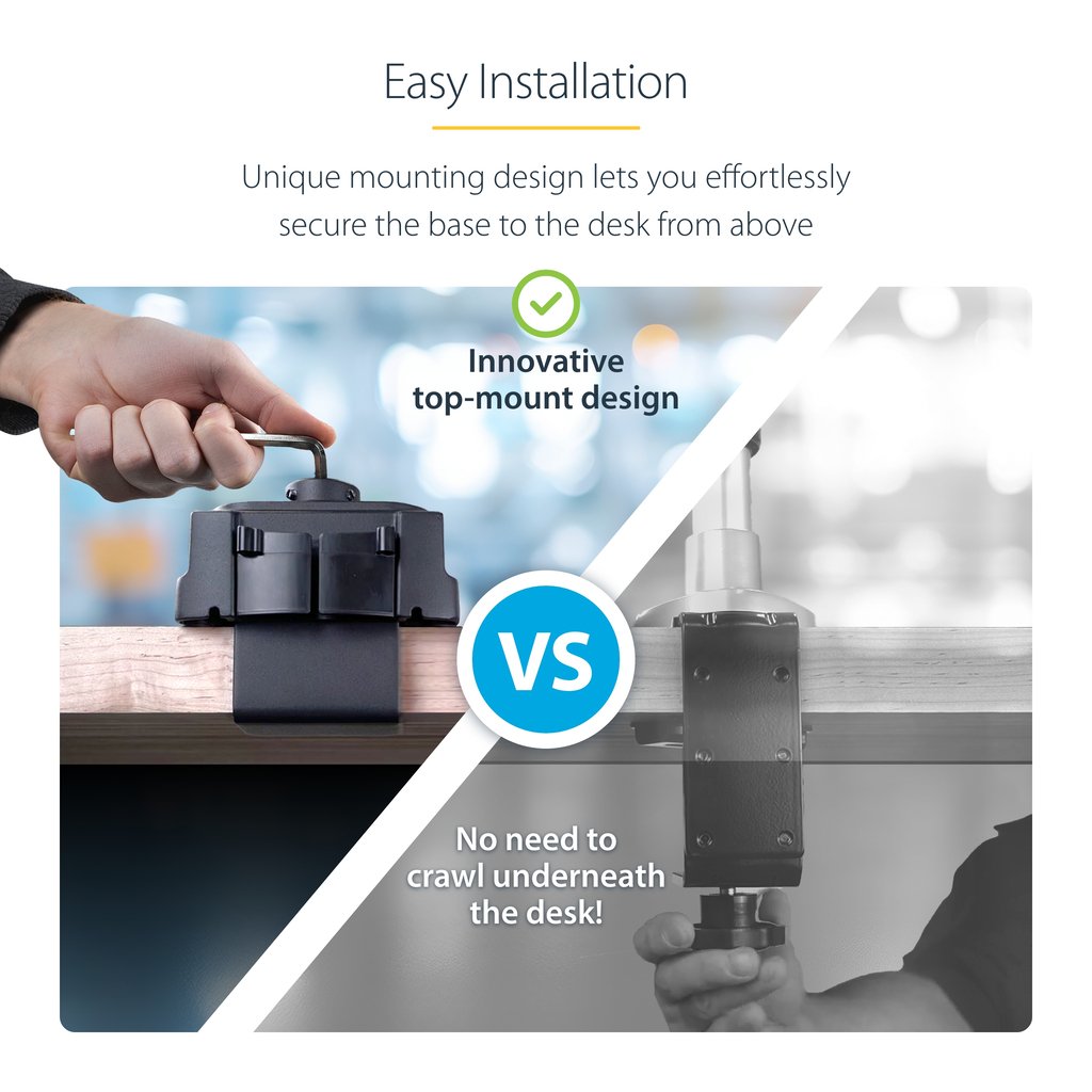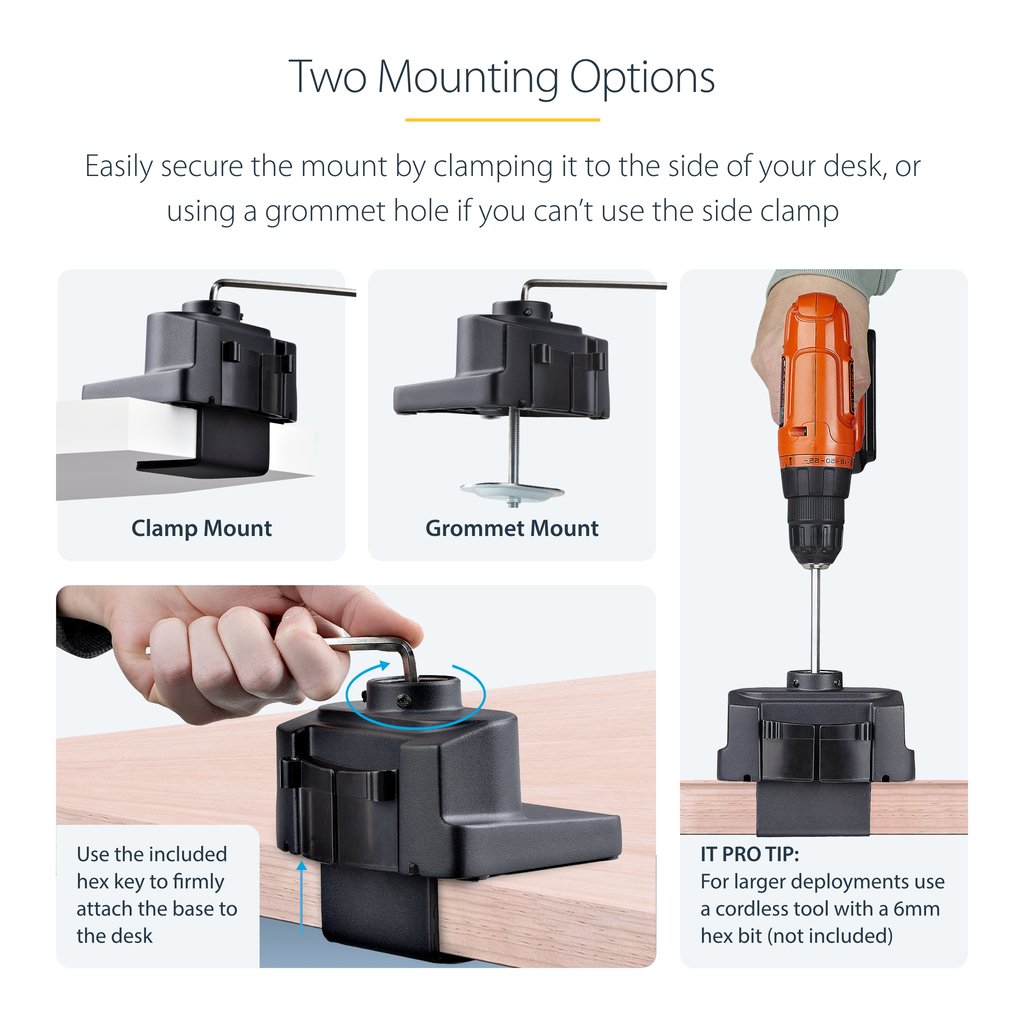 The unique top-screw desk clamp simplifies installation by enabling users to tighten the clamp from manually from above using a hex key or a hand drill, eliminating the need to go under the desk. In addition, the desk clamp is designed with an interchangeable C-clamp and grommet mount to accommodate desks up to 2 inches (50mm) thick, providing flexibility for different desk configurations.