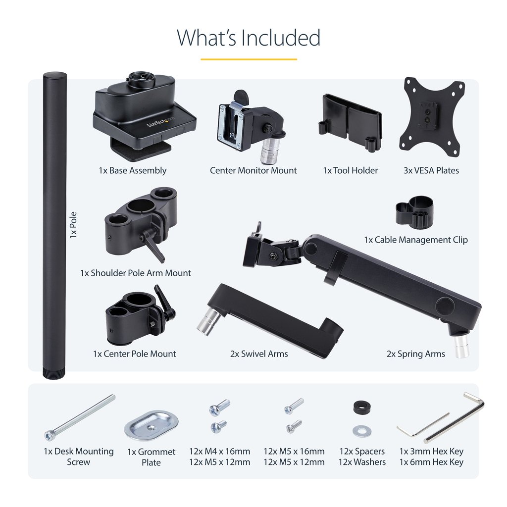 StarTech.com Triple Monitor Desk Mount For Up To Three 27in Screens, VESA 75×75/100×100, Tool-Less Arm Adjustments
