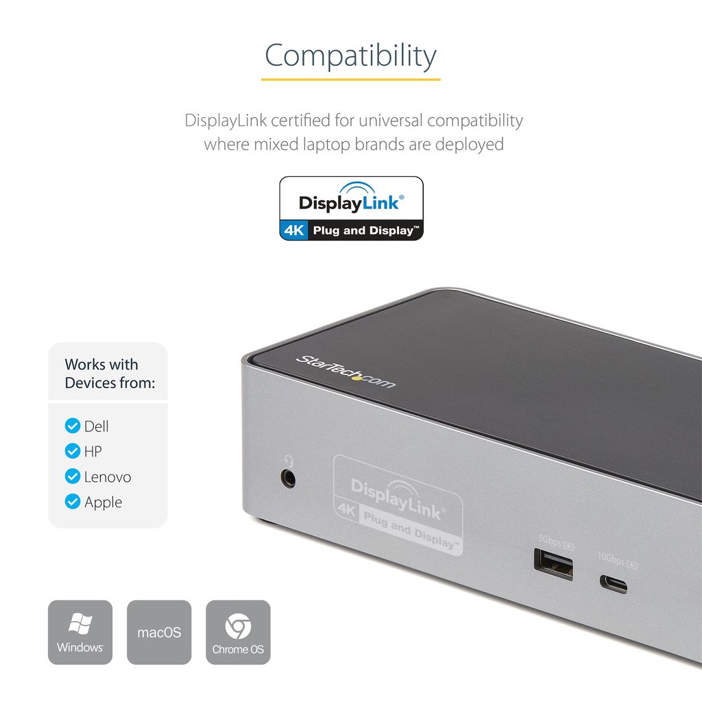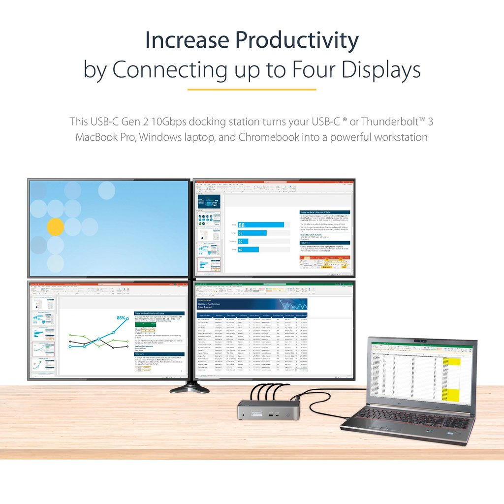 This USB-C Gen 2 10Gbps docking station turns your USB-C ® or Thunderbolt™ 3 MacBook Pro, Windows laptop, and Chromebook into a powerful workstation. A USB 3.2 Gen 2 Type-C dock features everything you need, from quad HDMI or DisplayPort video outputs up to 4K 60 Hz to 10Gbps USB-C & USB-A downstream peripheral ports to 100W Power Delivery.