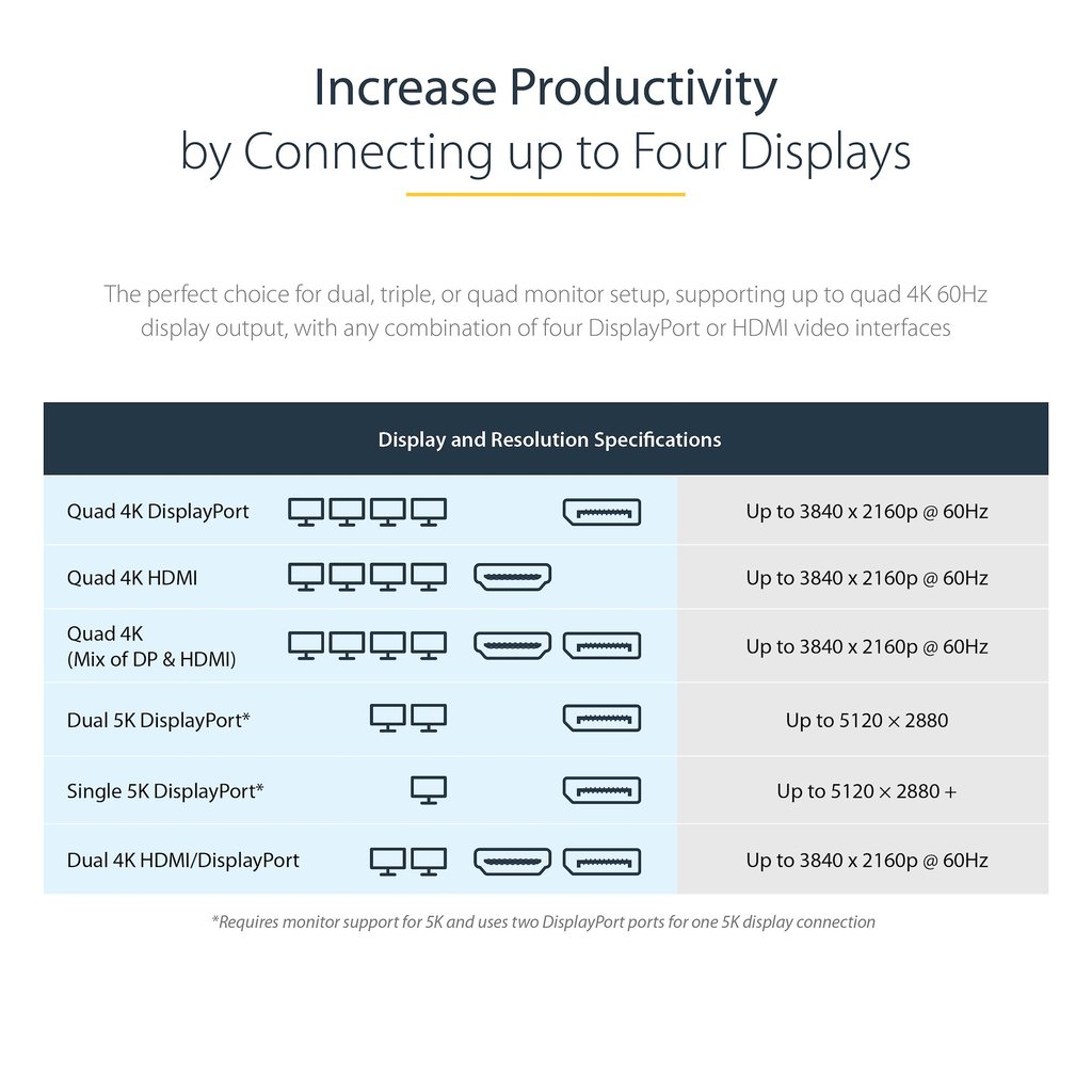 This USB-C Gen 2 docking station with DP 1.2 and HDMI 2.0 HDR support, is a perfect choice for dual, triple, or quad monitor setup, supporting up to quad 4K 60Hz display output, with any combination of four DisplayPort or HDMI video interfaces, on USB-C Gen 2 laptops, MacBooks (including M1 based systems) and Windows-based Thunderbolt 3 laptops.