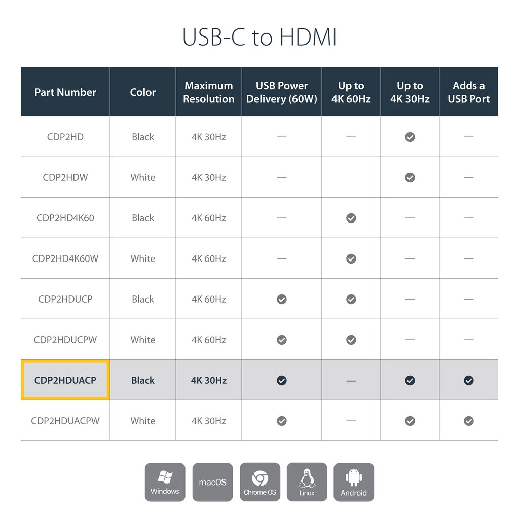 This USB-C to 4K HDMI adapter connects an HDMI display to your laptop or MacBook with USB Type-C. The USB C to HDMI adapter features USB Power Delivery, so you can power your laptop while outputting video, using the same USB-C port. The adapter is also available in white (CDP2HDUCPW), so you can choose an adapter that matches the style of your laptop.