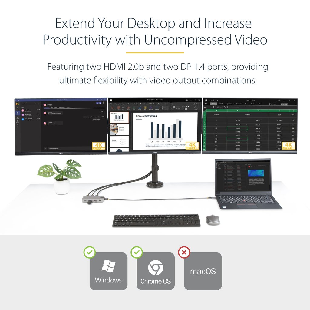 Create a mobile workstation with dual or triple 4K video via HDMI and/or DisplayPort (MST support required), three USB-A ports, Gigabit Ethernet and pass-through power delivery to charge the laptop
