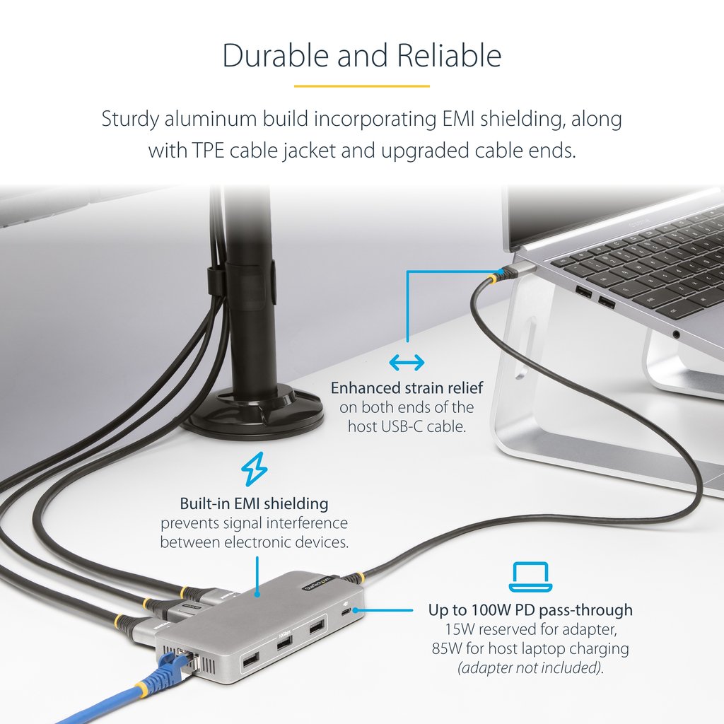 The mini docking station features a built-in 2 ft. (60 cm) USB-C host cable with a high-quality TPE jacket and strain relief, for enhanced durability and longevity. The Multiport Adapter housing features a built-in EMI shield to protect the main board and integrated chips from electromagnetic interference, preventing signal interference between electronic devices and ensuring reliable performance.