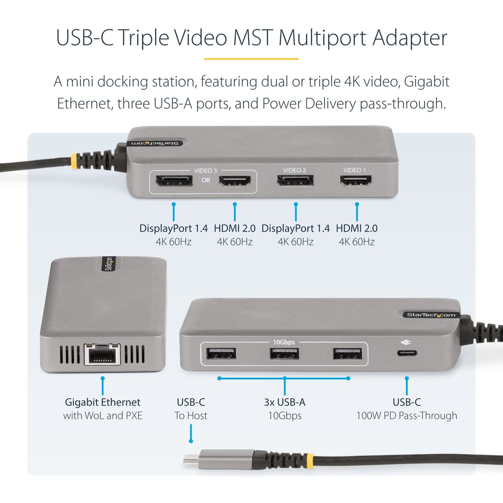 StarTech.com USB-C Triple Monitor Multiport Adapter, Dual 4K 60Hz + 4K 30Hz HDMI & DisplayPort, 3-Port USB 10Gbps Hub, 100W PD