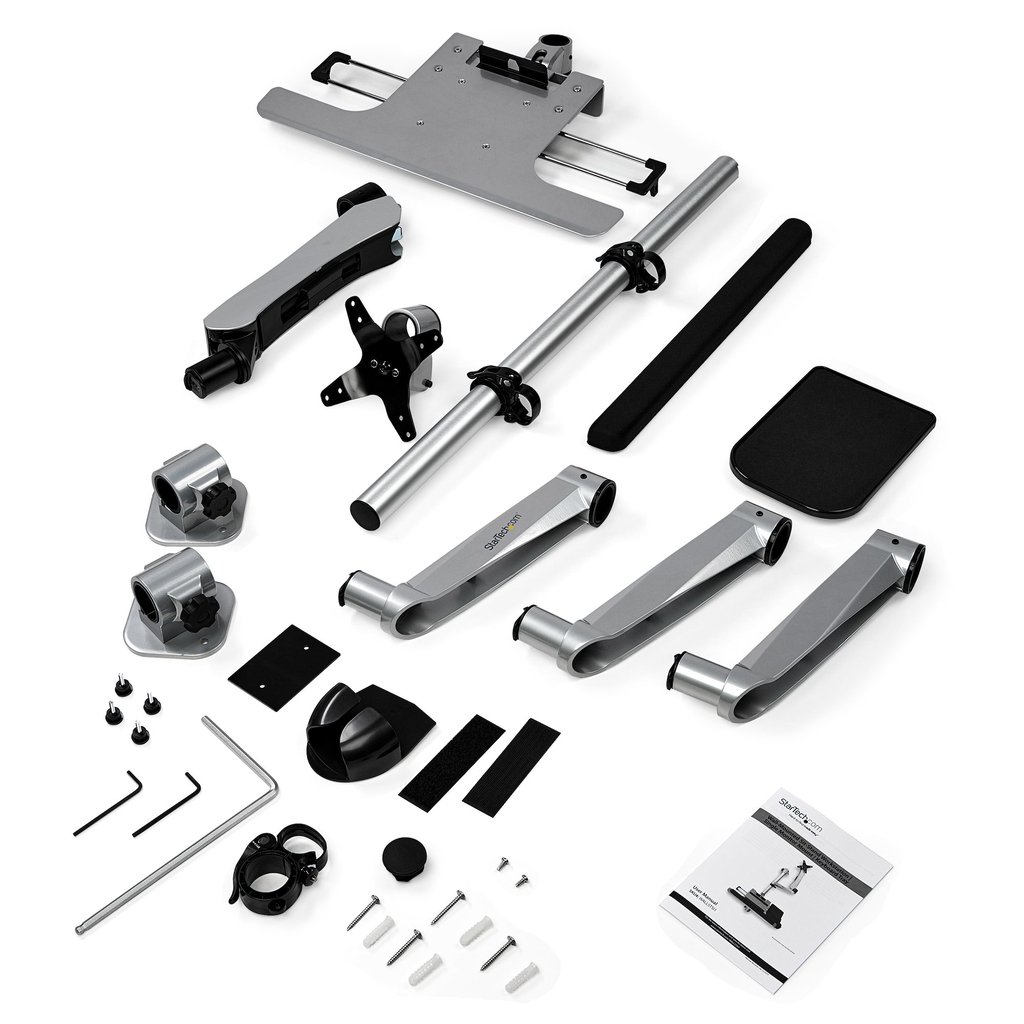 – RANGE OF MOTION: Monitor mount +90/-15° tilt, +/-120° swivel, 360° rotation; Keyboard Tray +90/-15° tilt; Height adjustable monitor arm, keyboard tray & cable mgmt clips can be placed along 17.5″ pole